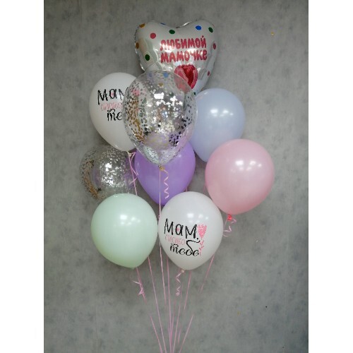 В набор входит фольгированный шар с надписью( можно заменить на любой другой), 2 шара с блестками, 2 шара для мамы и 4 шарика однотонных